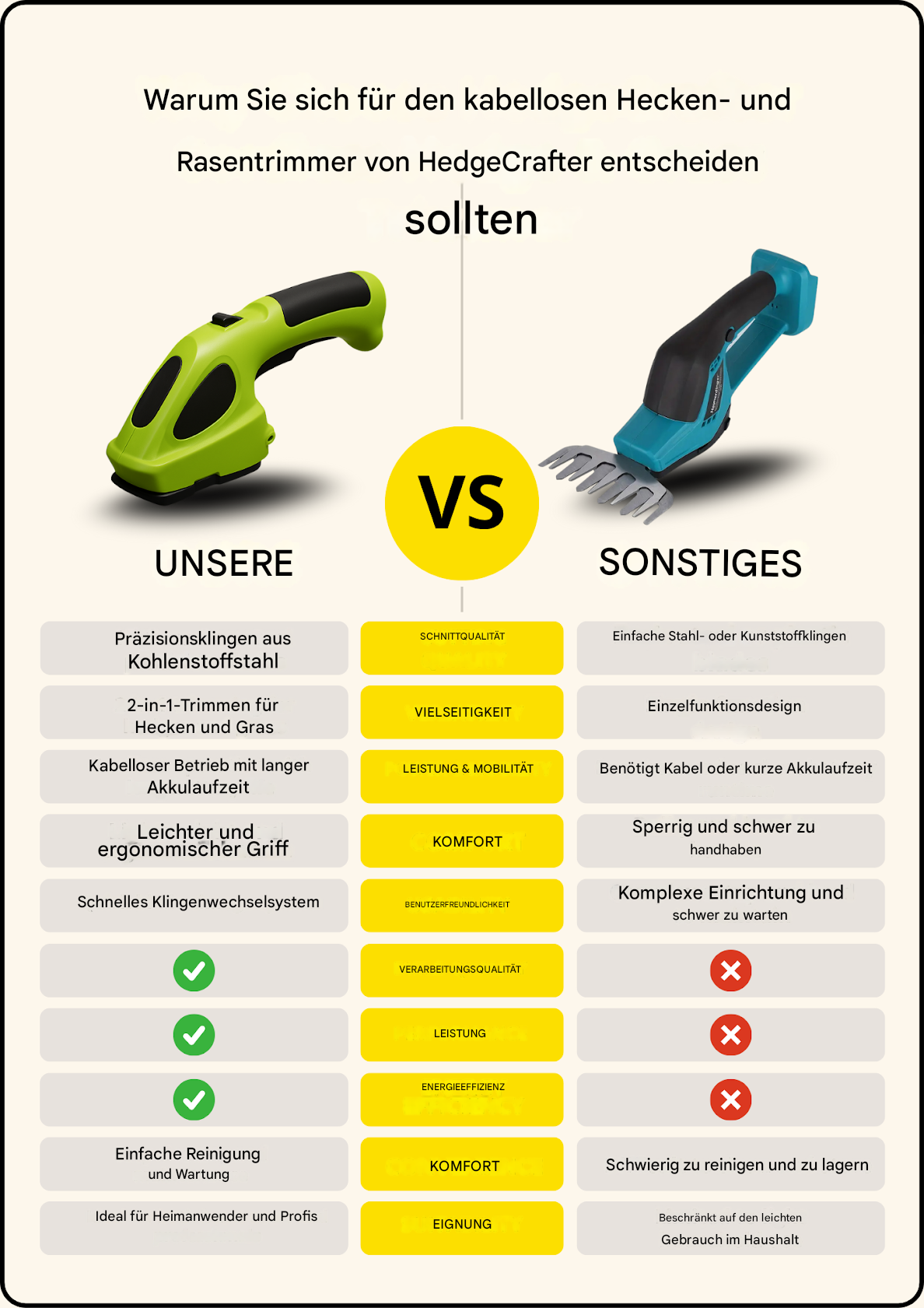 HedgeCrafter ist aus schlagfesten Materialien und mit einem langlebigen Klingensystem gefertigt und für den regelmäßigen Einsatz im Garten ausgelegt, wobei Leistung und Zuverlässigkeit erhalten bleiben.