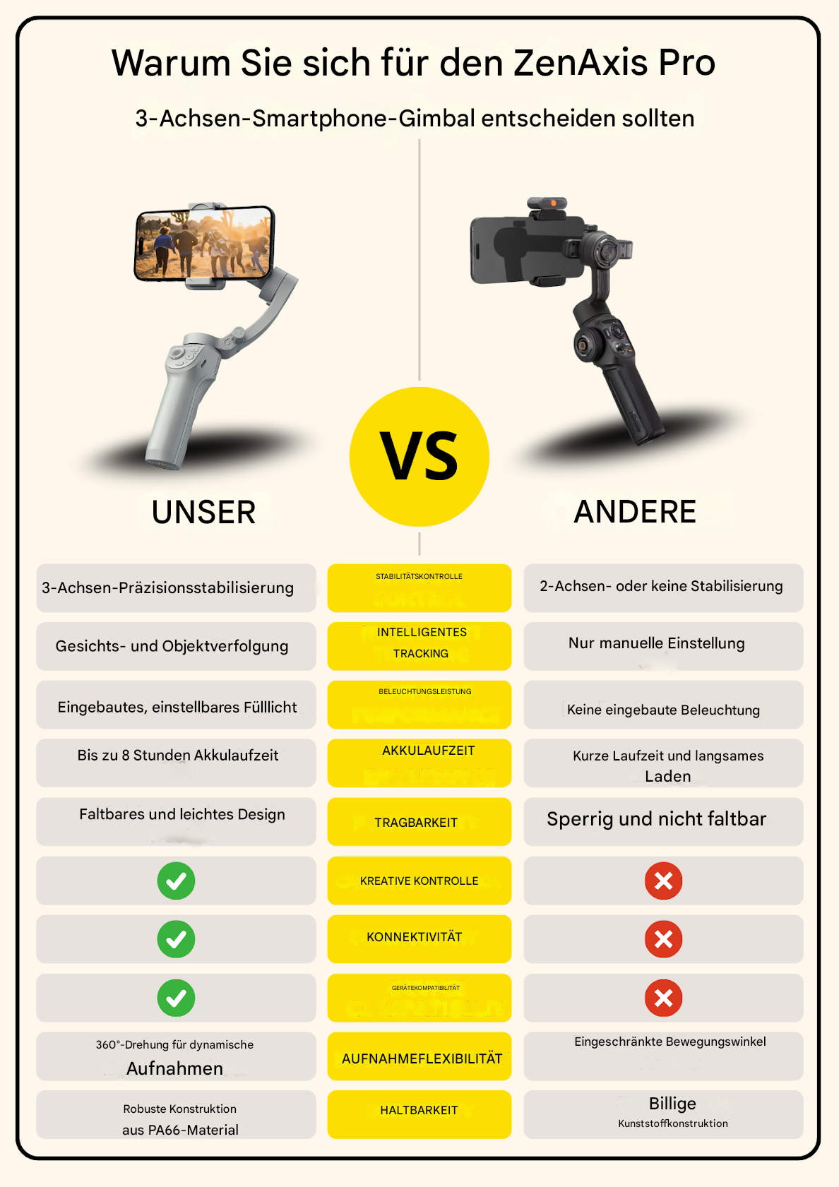 Die fortschrittliche Motorbalance sorgt für optimale Videostabilität bei jeder Bewegung. Egal, ob Sie gehen, laufen oder dynamische Szenen filmen, ZenAxis Pro sorgt für flüssige, kinoreife Aufnahmen.