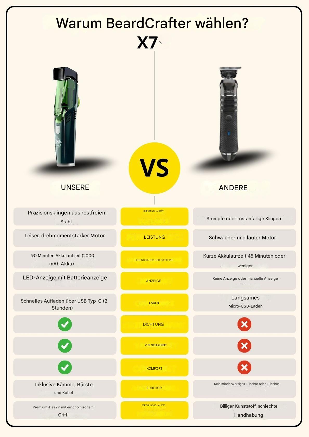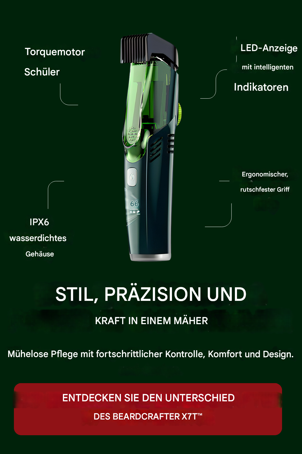 Der BeardCrafter X7 ist für den täglichen Gebrauch konzipiert und verfügt über ein wasserdichtes IPX6-Design, das sich einfach unter fließendem Wasser abspülen lässt. Bleiben Sie hygienisch und bereit für Ihren nächsten Schnitt in Sekundenschnelle